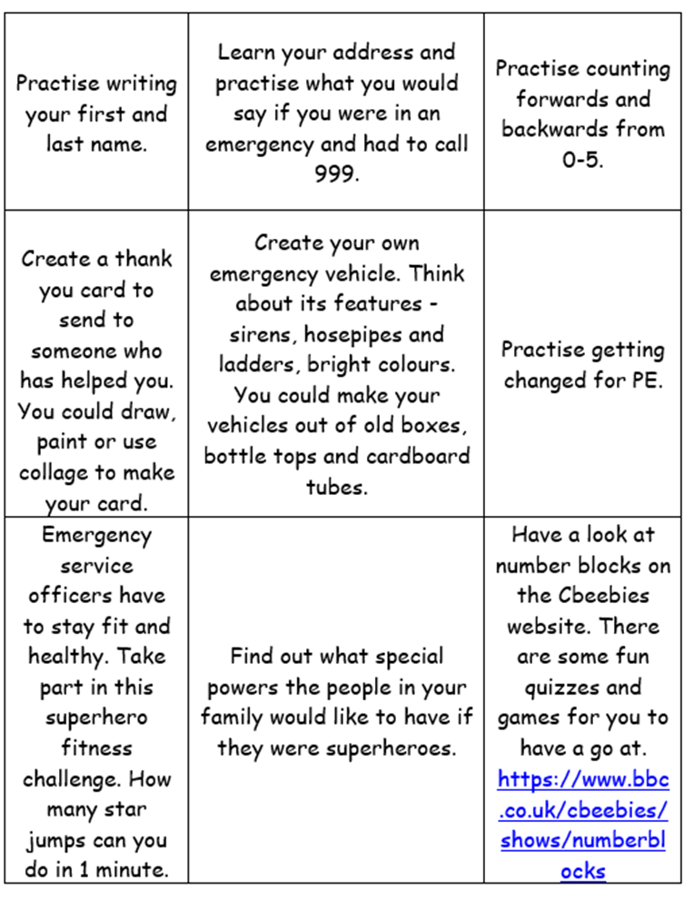 Each half term we will send out a home learning bingo grid with tasks for you to complete at home. Here are this half term’s challenges for you to try.