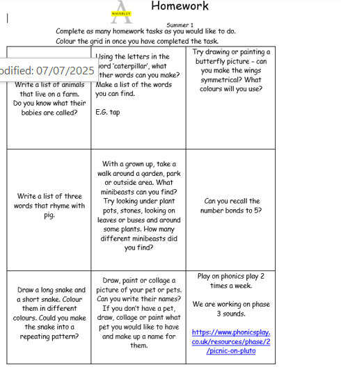 Each half term we will send out a home learning bingo grid with tasks for you to complete at home. Here are this half term’s challenges for you to try.
