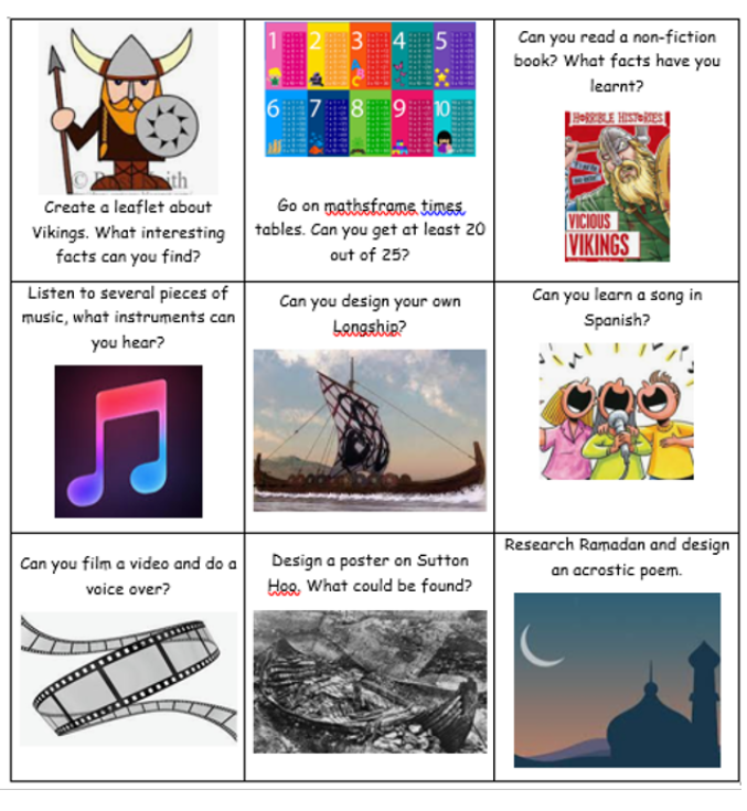 Each half term we will send out a home learning bingo grid with tasks for you to complete at home. Here are this half term’s challenges for you to try.
