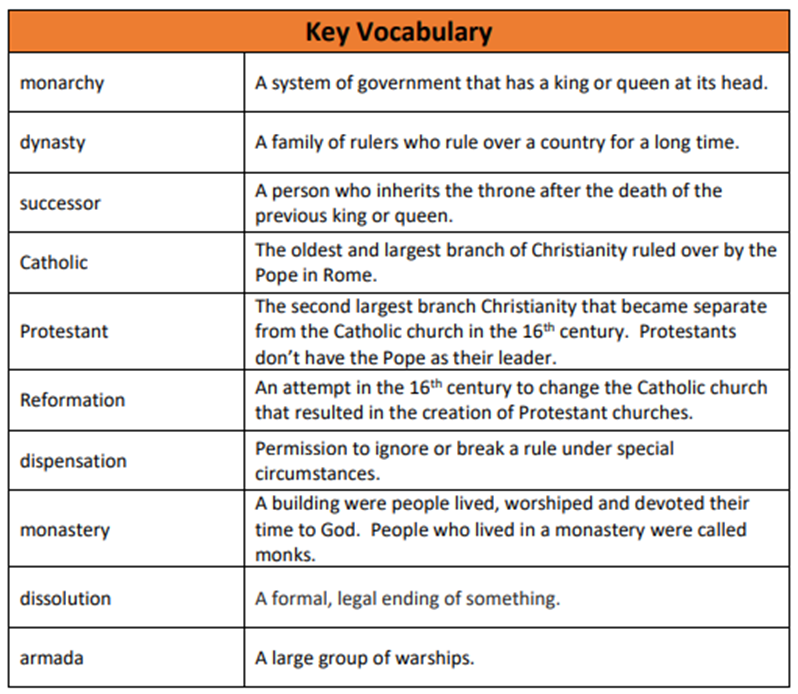 Our first topic ‘The Tudors’ will take us back to the death of King Henry VII and the reign of Henry VIII. We will be learning about how the Tudors became the rulers of Great Britain and Northern Ireland. We will be looking at the Battle of Bosworth and what occurred during this time. We will also be finding out about King Henry VIII’s lavish lifestyle and his marriages during his life.