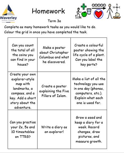 Each half term we will send out a home learning bingo grid with tasks for you to complete at home. Here are this half term’s challenges for you to try.